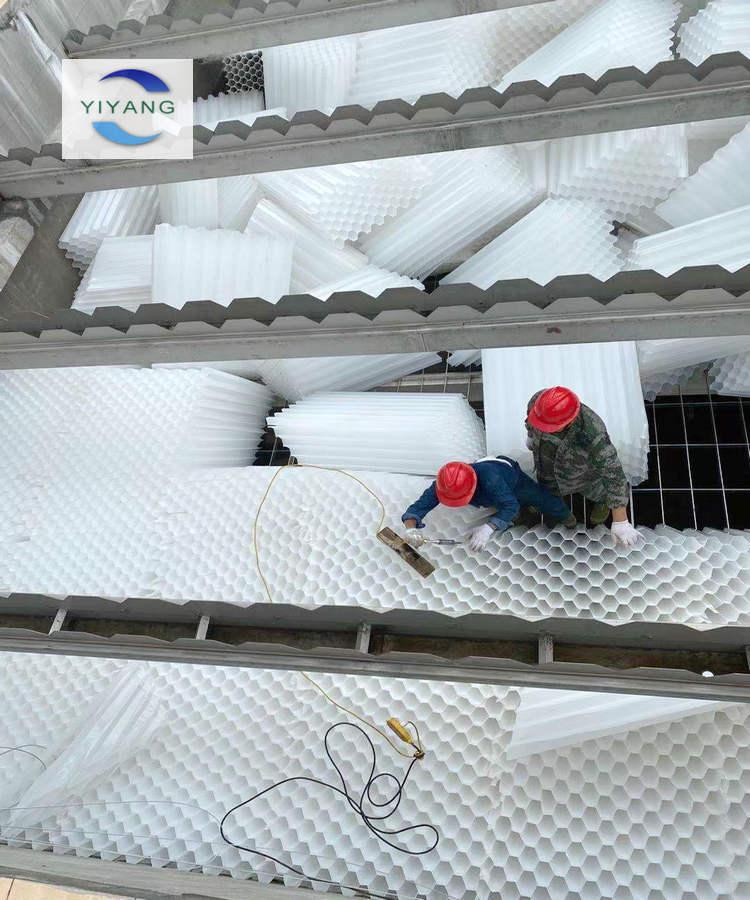3、進(jìn)行蜂窩斜管填料的焊接:現(xiàn)場通電、場地寬敞、開始進(jìn)行六角蜂窩斜管填料的焊接服務(wù),上一張斜管和下一張斜管接觸的部分用加熱的電烙鐵粘結(jié),熱接縫完成后,一個單元的蜂窩斜管為1m2。以此類推將現(xiàn)場的蜂窩斜管填料焊接完畢,留部分備用,焊接陰角、陽角。