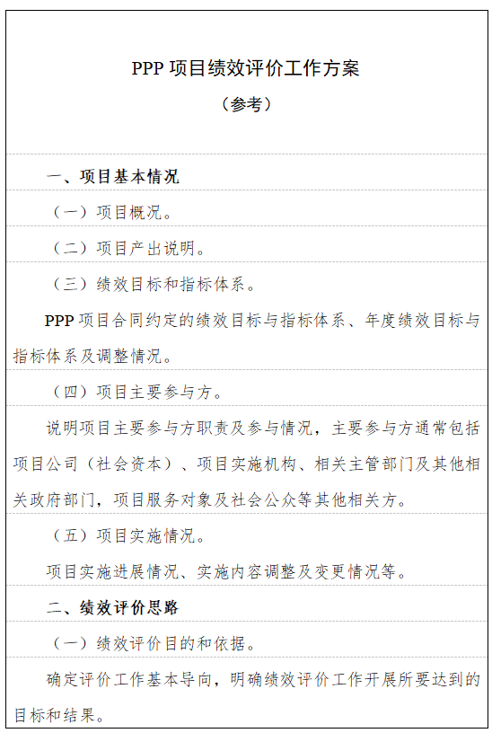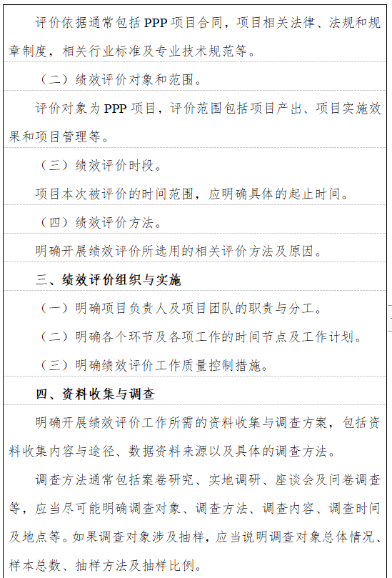 (二)制定績效評價工作方案。項目實施機構(gòu)應(yīng)根據(jù)政策要求及項目實際組織編制績效評價工作方案,內(nèi)容通常包括項目基本情況、績效目標(biāo)和指標(biāo)體系、評價目的和依據(jù)、評價對象和范圍、評價方法、組織與實施計劃、資料收集與調(diào)查等。項目實施機構(gòu)應(yīng)組織專家對項目建設(shè)期、運營期首次及移交完成后績效評價工作方案進行評審。