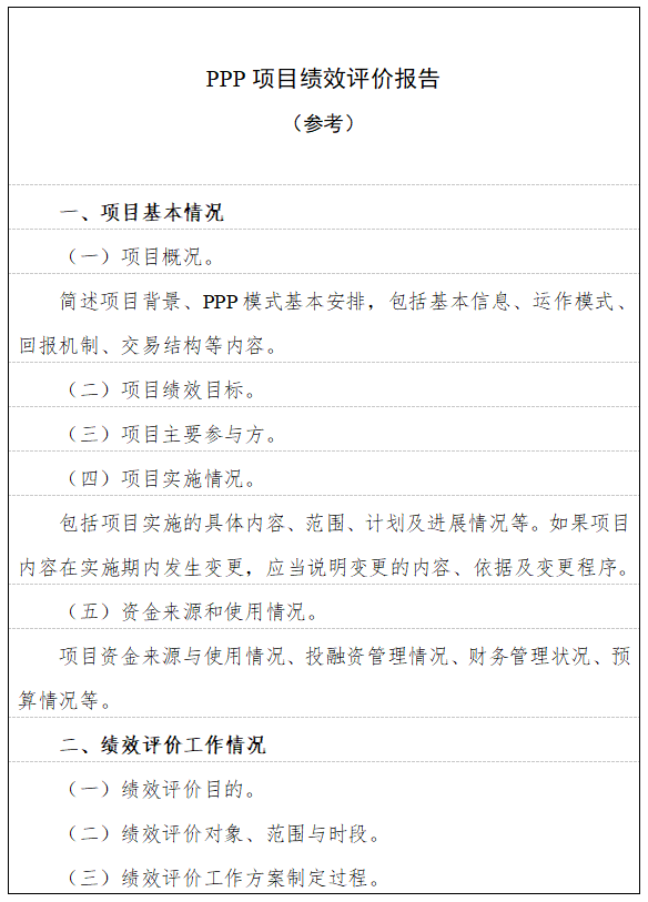 (四)編制績效評價報告。PPP項目績效評價報告應(yīng)當(dāng)依據(jù)充分、真實完整、數(shù)據(jù)準(zhǔn)確、客觀公正,內(nèi)容通常包括項目基本情況、績效評價工作情況、評價結(jié)論和績效分析、存在問題及原因分析、相關(guān)建議、其他需要說明的問題。