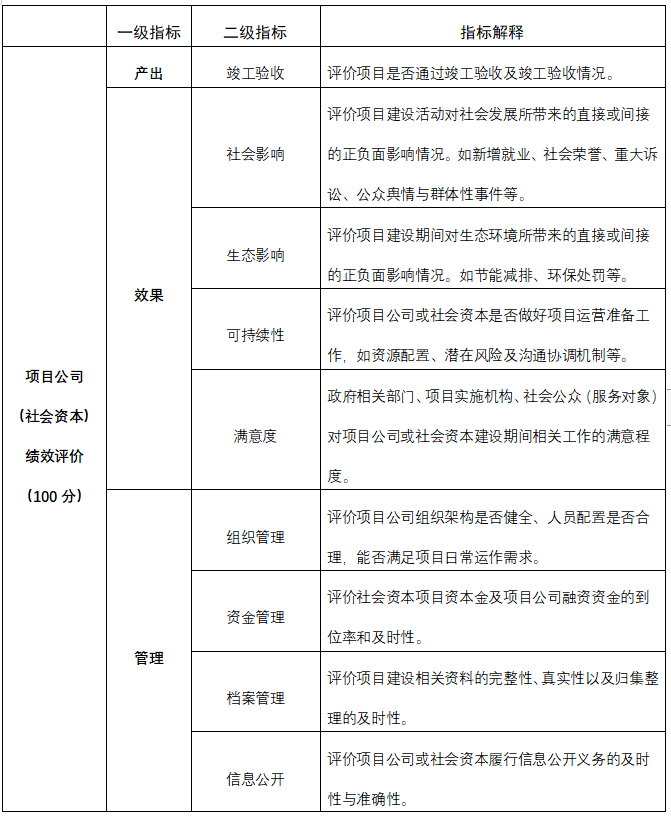 第十條 PPP項目績效指標(biāo)體系由績效指標(biāo)、指標(biāo)解釋、指標(biāo)權(quán)重、數(shù)據(jù)來源、評價標(biāo)準(zhǔn)與評分方法構(gòu)成。