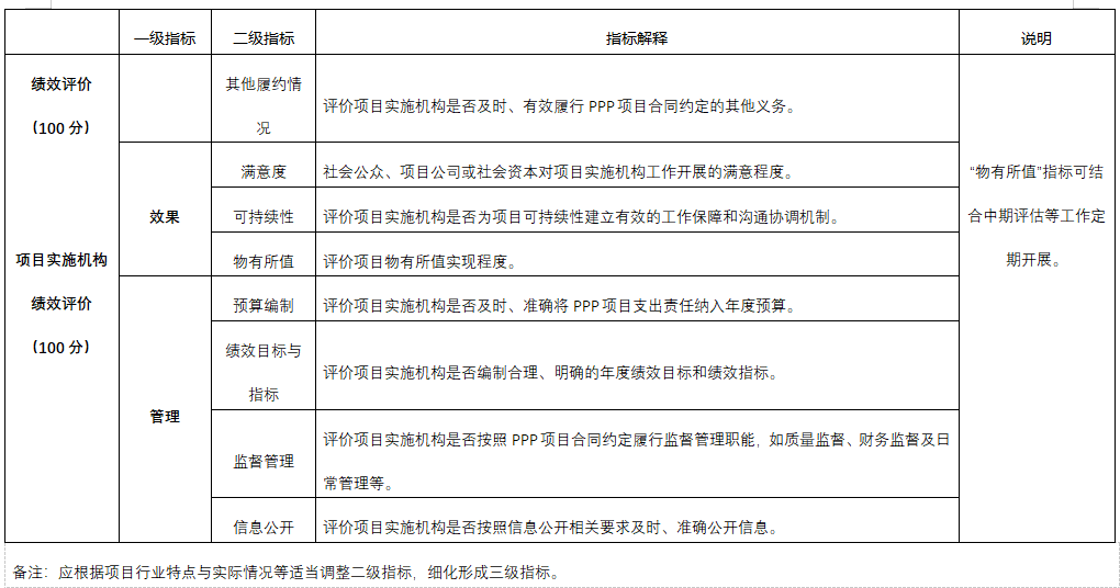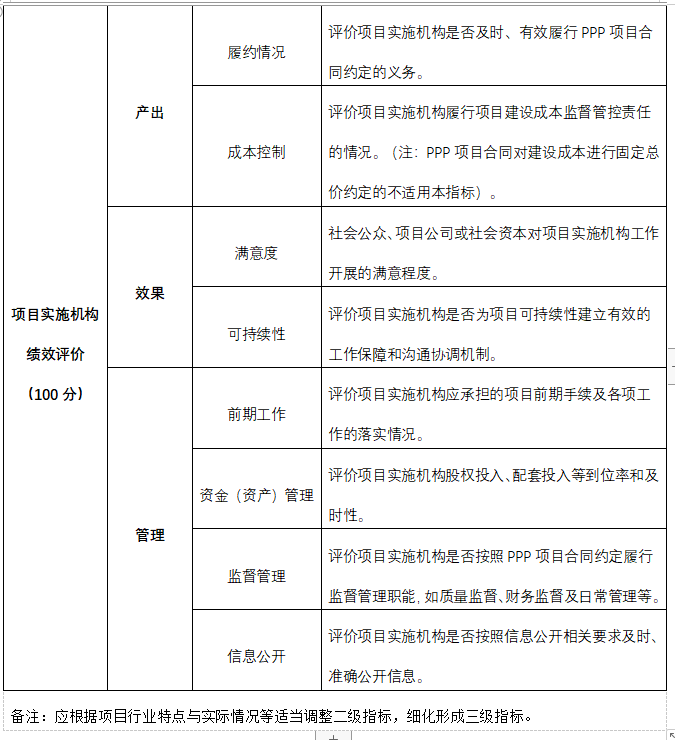 (二)PPP項目采購階段,項目實施機構(gòu)可結(jié)合社會資本響應(yīng)及合同談判情況對績效指標(biāo)體系中非實質(zhì)性內(nèi)容進行合理調(diào)整。PPP項目績效目標(biāo)和指標(biāo)體系應(yīng)在項目合同中予以明確。