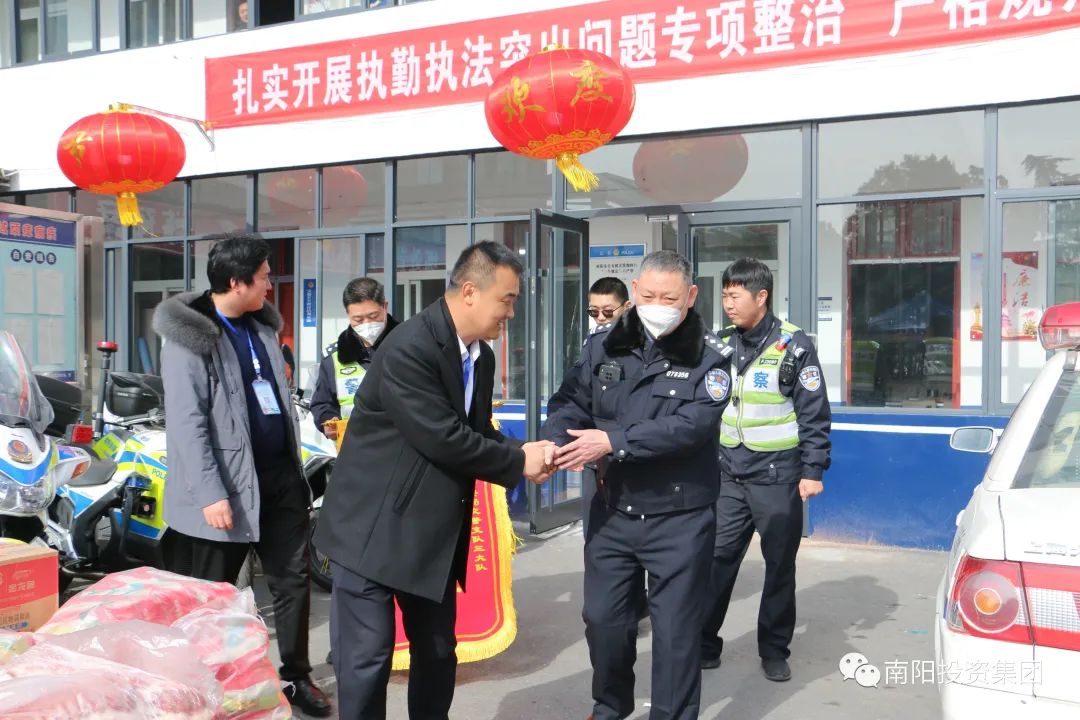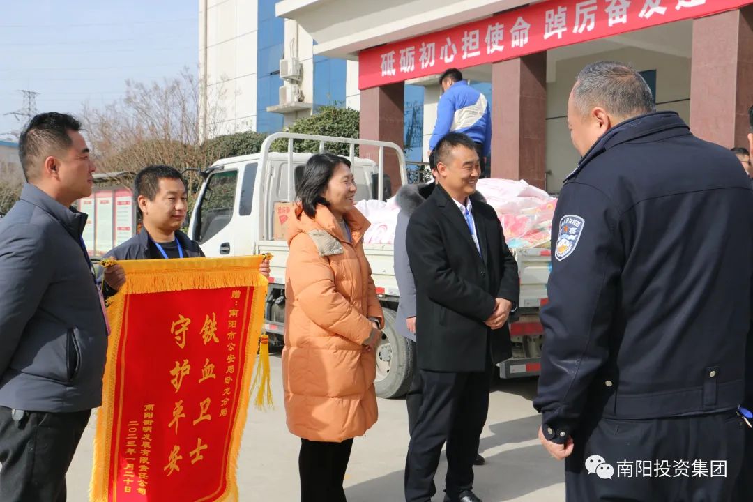 1月20日,南陽衡明發(fā)展有限責任公司董事長、總經(jīng)理趙書沛將一面寫著“鐵血衛(wèi)士守護平安”的錦旗贈送至南陽市公安局臥龍區(qū)公安分局和南陽市公安局交通管理支隊第三勤務大隊,并帶來了慰問品,向公安干警致以新春問候和誠摯祝福。