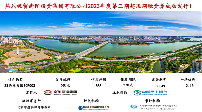 南陽(yáng)投資集團(tuán)2023年度第三期超短期融資券(23南投集團(tuán)SCP003)于2023年9月26日成功發(fā)行,金額6億元,票面利率3.04%,全場(chǎng)倍數(shù)2.13倍,由民生銀行承銷,創(chuàng)2023年下半年河南省同評(píng)級(jí)同期限城投類企業(yè)發(fā)行價(jià)格新低!