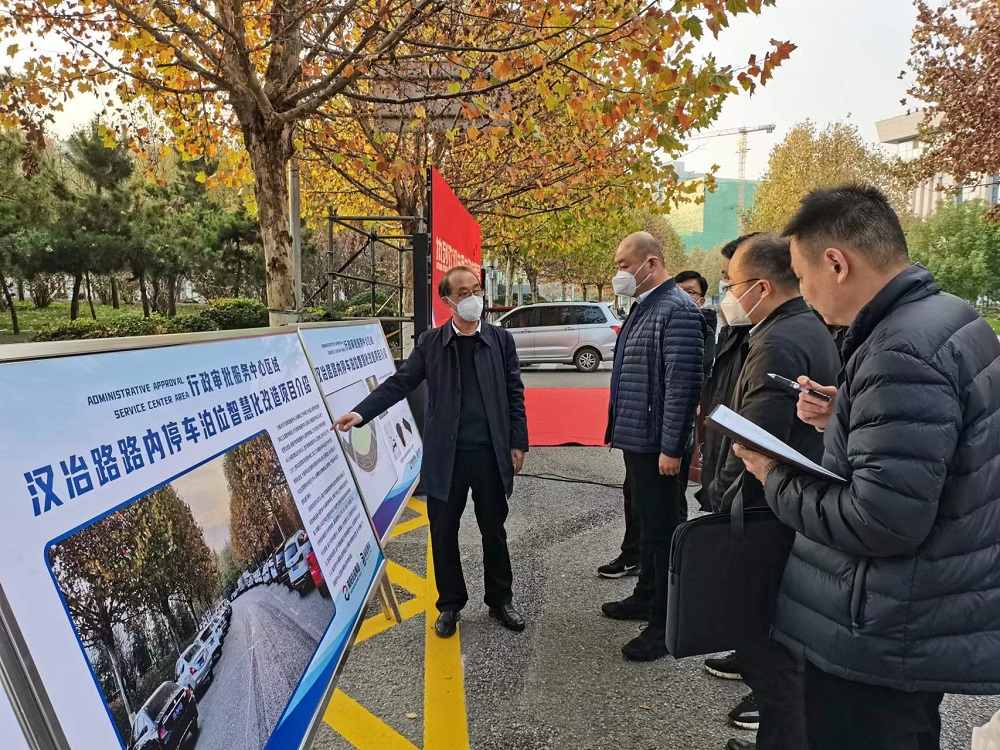 南陽(yáng)投資集團(tuán)黨委書(shū)記、董事長(zhǎng)劉九利(左一)在市城區(qū)漢冶路路內(nèi)停車泊位智慧化改造項(xiàng)目現(xiàn)場(chǎng)辦公
