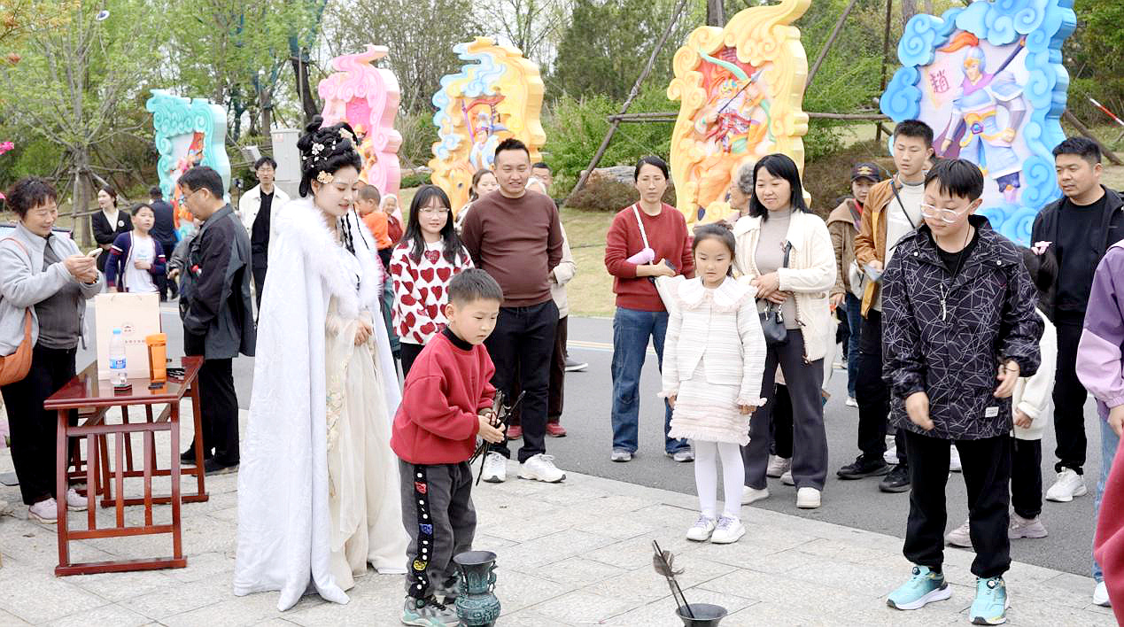 羅衣何飄飄,輕裾隨風(fēng)還,“十二花神”迎春風(fēng)而舞,引來觀眾陣陣掌聲深受熱捧;非遺茶百戲、貼花鈿、漢婚大典、簪百花、器樂演奏等特色傳統(tǒng)活動,讓眾人感受到國風(fēng)美學(xué)的別樣魅力;園區(qū)特別設(shè)置與十二花仙游戲互動的《龍崗百花譜》,使游客沉浸式體驗NPC集章打卡的樂趣;十二位賣花郎,背簍提籃,呼朋伴友,與春同行,邀游客共赴這一場春日之約。