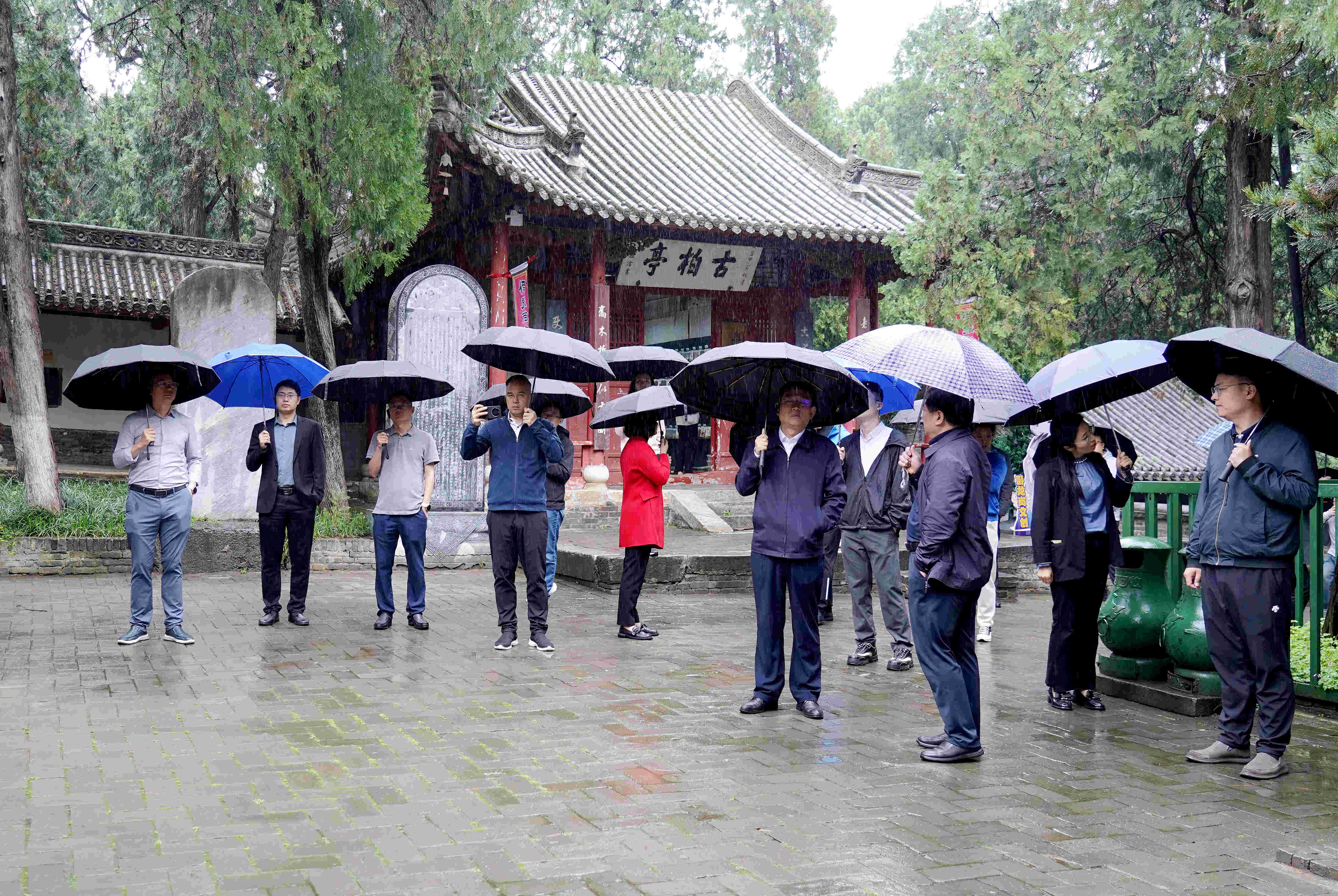 在蒼柏翠竹的掩映下,煙雨中的臥龍崗文化園景區(qū)紅墻灰瓦,矗立的古建筑以及林立的牌坊碑刻仿佛在訴說著曾經(jīng)的輝煌與滄桑。考察團(tuán)一行相繼參觀了大拜殿、岳飛手書諸《出師表》碑廊、諸葛草廬、三顧堂等臥龍崗著名景觀,感受了三國文化、楚漢文化和諸葛文化,領(lǐng)略了這千年龍脈之崗深厚的文化積淀,以及南陽文旅產(chǎn)業(yè)的繁榮發(fā)展。