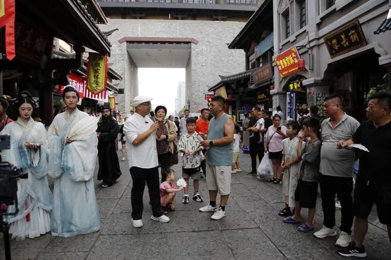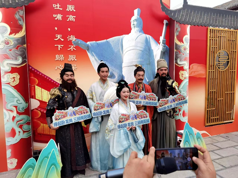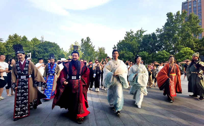 當(dāng)天下午,宣傳推介團(tuán)隊(duì)走進(jìn)許昌胖東來天使城,與許昌熱情市民互動。在曹魏古城和丞相府景區(qū),臥龍崗武候祠景區(qū)演藝團(tuán)隊(duì)扮演的諸葛亮、黃月英、劉備、關(guān)羽、張飛等三國人物吸引了眾多當(dāng)?shù)厝罕娗皝韲^,演員們帶來的情景劇、舞蹈和互動游戲受到當(dāng)?shù)厝罕?、游客的連連稱贊?,F(xiàn)場還通過游客互動、搶答三國歷史文化問題等形式,向游客贈送我?guī)埦皡^(qū)門票以及旅游宣傳資料?;顒蝇F(xiàn)場人氣火爆,大家紛紛表示要到到南陽走一走、看一看,讓更多人關(guān)注南陽、來到南陽、愛上南陽。