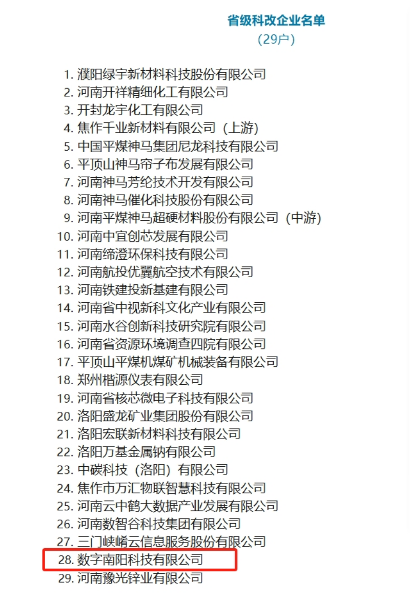 近日,省政府國(guó)資委印發(fā)《關(guān)于公布省級(jí)科改企業(yè)和專精特新星變計(jì)劃企業(yè)名單的通知》,河南省首批共有29戶省級(jí)科改企業(yè)和50戶專精特新星變計(jì)劃企業(yè)入選。其中,數(shù)字南陽(yáng)科技有限公司入選省級(jí)科改企業(yè)名單。