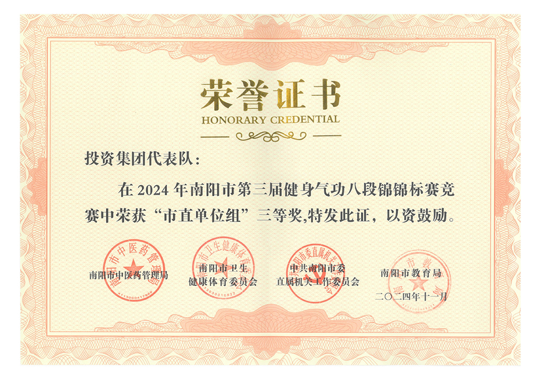 由南陽市中醫(yī)藥管理局、南陽市衛(wèi)生健康體育委員會(huì)、中共南陽市委直屬機(jī)關(guān)工作委員會(huì)、南陽市教育局聯(lián)合主辦的“南陽市第三屆健身氣功八段錦錦標(biāo)賽”于2024年10月29日至30日成功舉辦。南陽投資集團(tuán)代表隊(duì)同來自市直各單位的20支代表隊(duì)齊聚一堂,同臺(tái)競技,首次參賽榮獲“市直單位組”三等獎(jiǎng)。